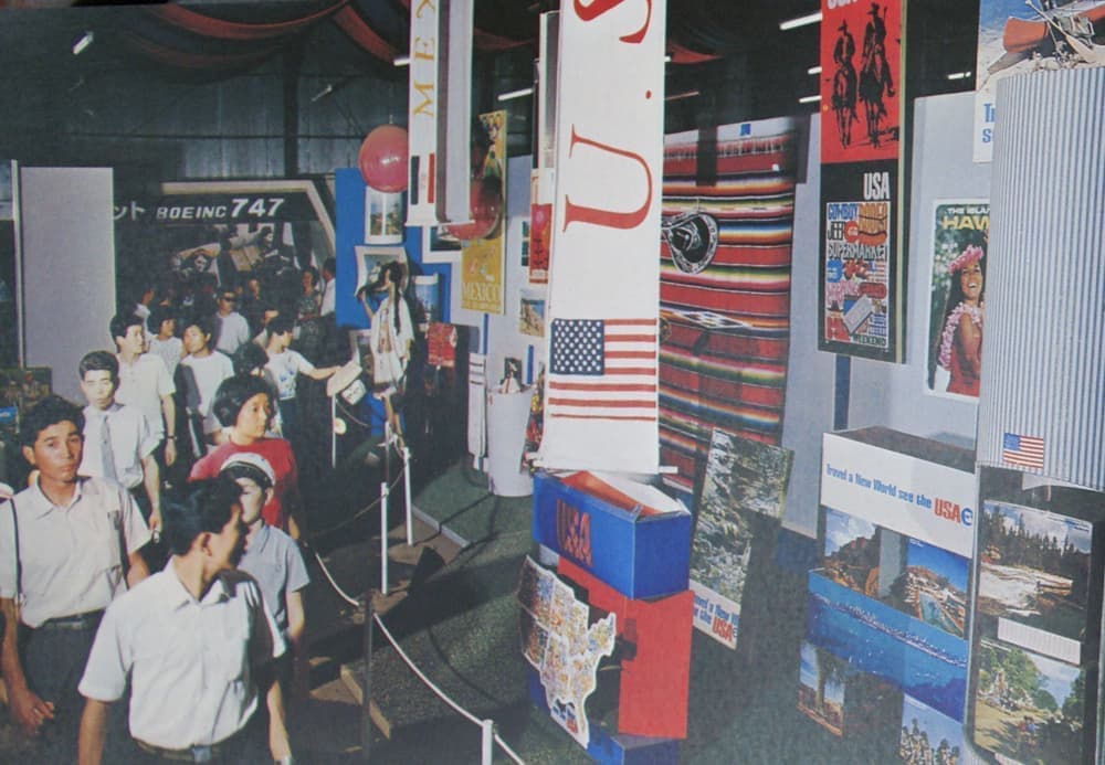 諸外国のなかではアメリカが単独でパビリオンを設けました。大会主催者の強い要望によるもののようです。「当館のテーマは〝きのうとあすのフロンティア〟。道博のテーマ〝風雪百年 輝く未来〟にぴったりと沿うもので、アメリカに見る西部開拓の〝風雪〟と宇宙へ伸びる〝輝く未来〟を独立館の中に描き出した」としています。アームストロング船長が実際に着用した実物の宇宙服の展示は国内初でした。ちなみに同船長による人類初の月面着陸はこの1年後のことです。
