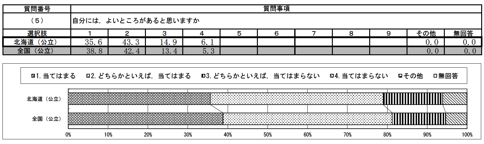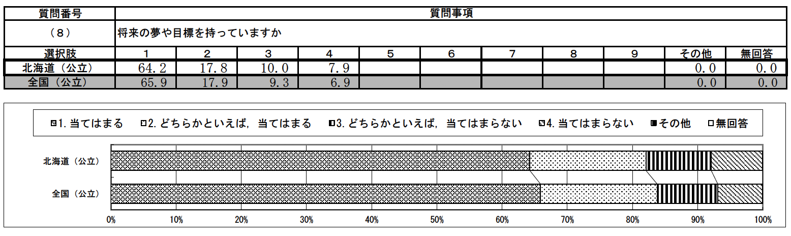 自己への肯定感は、物事に対する積極性、将来への意欲、周囲との協調性など、ポジティブな価値観の土台となるものです。北海道の子どもたちが (8)「将来の夢や目標を持っていますか」という設問で全国を下回るのは、そうした現れと思われます。