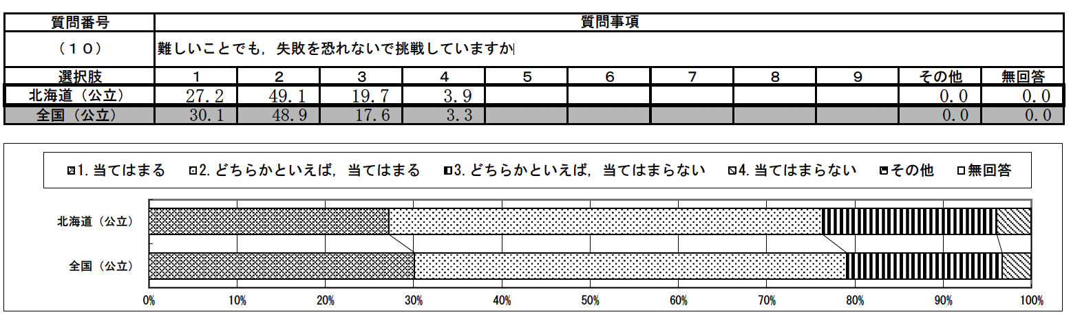 開拓は大自然が与えた試練への挑戦です。困難を克服していった中には開拓地ならではの助け合いの精神がありました。開拓を否定することは、こうした開拓という父祖の偉業が私たちに残してくれた数々の素晴らしい観念を失うことです。 (10)「難しいことでも、失敗を恐れないで挑戦していますか」という設問で全国を下回ったことは、父祖の想いが私たちの代で断絶している悲しい現実を示しています。