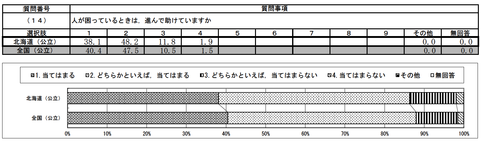 (14)「人が困っているときは,進んで助けていますか」という設問で低調なのは、父祖の歴史、開拓者精神が否定された結果、「自分だけがよければいい」「いまがよければいい」という利己主義、刹那主義が、北海道に広がっている現れと思われてなりません。利己主義、刹那主義とも、北海道の開拓精神から最も遠いものです。