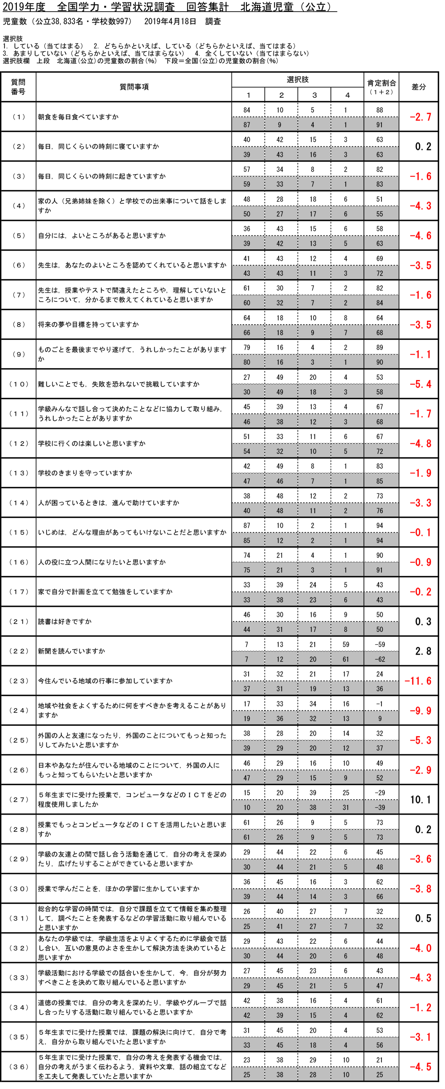 全部で57ある設問の中で気になった5つを取り上げましたが、全体的にほとんどの項目で北海道の子どもたちは全国平均を下回っています。次は、アンケートから教科に関わる設問などを除いた33の設問の回答状況をまとめたものです。ポジティブな回答割合が全国を上回ったのは6項目だけでした。