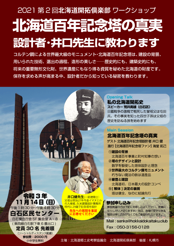 北海道百年記念塔の存続に向け12月の北海道議会が大きな山場になってきました。北海道百年記念塔を守る会様もこれに向けた動きを準備中です。こうしたなかで、存続に向けた気運を少しでも盛り上げようと、当方のできる最大のこととして井口先生をお招きし、北海道百年記念塔の正しい姿を学ぶ学習会=ワークショップを11月14日に開催します。