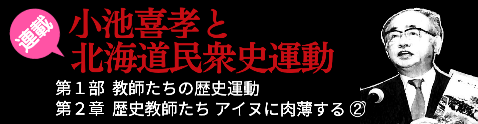 なお元北大教育学部長の鈴木朝英に代わって、井上司が正式に同会第3代会長に就任するのは1977年の第22回道歴教協会員総会です。この総会で山下国幸、そして本連載の主人公・小池喜孝、さらに『コタンに生きる』の著者で、後の釧路アイヌ文化懇話会の会長・松本成美が副会長に就任しました。[10]