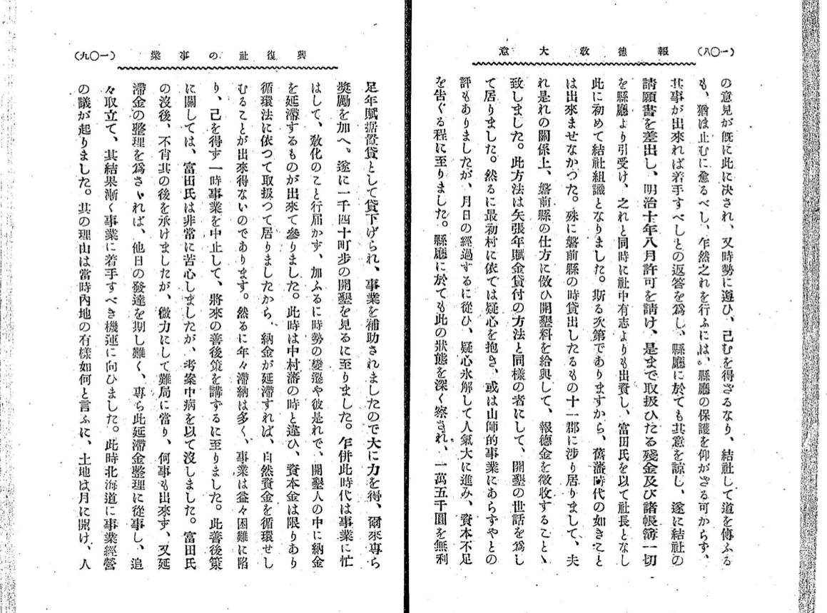 二宮尊徳先生の令孫たる二宮尊親先生は、祖父の意志を継ぎ、今や北海道十勝国に於いて、興復社と言ふを経営し、その社長として済世救民の事業に従事して居られます。其の事業の大要は、先生が去る明治三十八年二月二十二日、東京神田の学士会に於いて講演されたのが、最も要領を得ておりますから、此処に其の筆記を載せる事としました。[1]