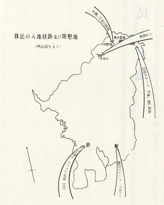 さて、鉄之助は、新保鉄蔵のところで、アイヌ1名を雇い、今のネシコシ、オルイカ、幌内を経て馬追山を越え、現在の三河道路を途中から古山に出て、夕張川畔に達し、さらに夕張川沿に下り、現在の山形道路の旧道(アイヌ道路)越えて、現星野沢から古川(現在はないが堺川といった)沿に平地に出て、付近の土地を調査した。結果、農耕の適地とみて、ここに移住する決心を固めた。
