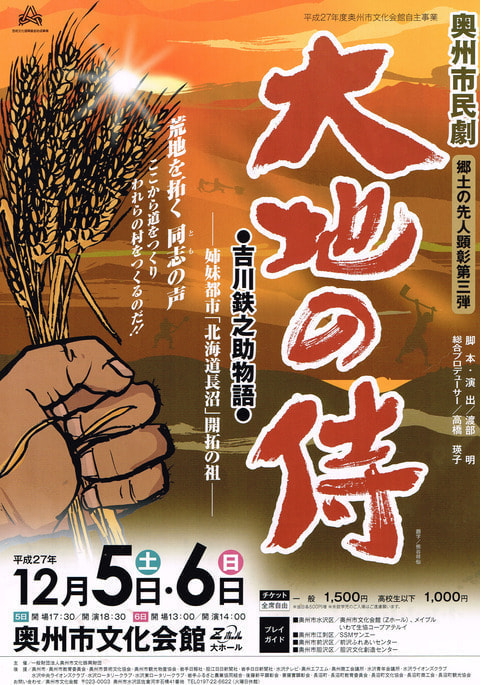 平成29(2017)年12月、このことが長沼町に伝わると、長沼町の開拓130年記念事業として取り上げられ、奥州市と長沼町民の合同により、北広島市民ホールで「大地の侍」が上演されました。