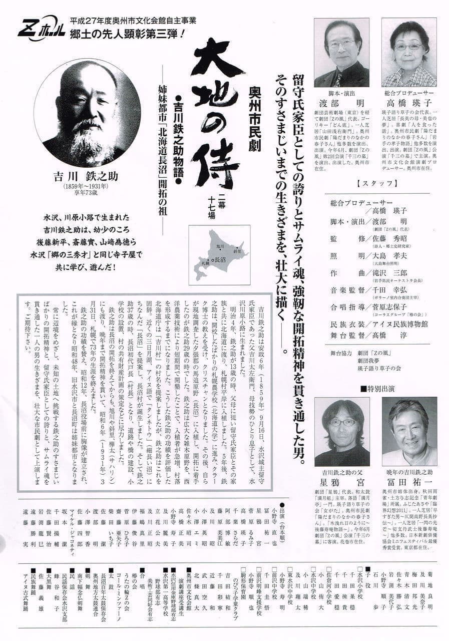 そればかりではありません。2015(2015)年11月、奥州市は演劇を通して郷土の偉人から学ぶ事業を立ち上げ、その第三弾として吉川鉄之助を取り上げ「大地の侍」として上演しました[9]。そのチラシにはこうあります。