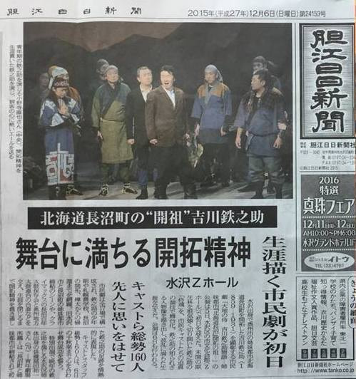 「大地の侍」上演を伝える地元紙。北海道では見られない文字が見出しを飾っている