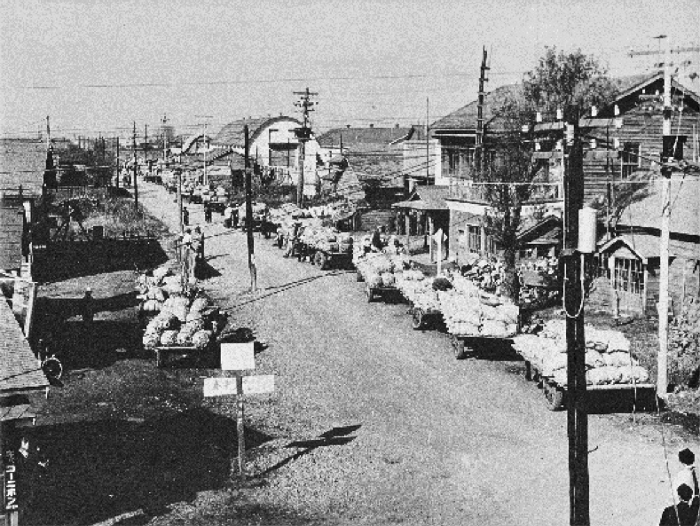 昭和38年の米の出荷風景ですが、鵡川の発展に入鹿別道路が大きく貢献したことは確かです(出典①)