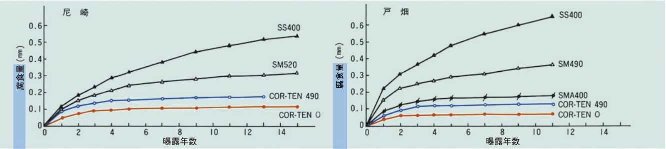 コルテン鋼は錆がある程度すすむとそれ以上腐食が進まなくなるんです。このグラフを見てください。赤い線がコルテン鋼ですが、2年目当たりから腐食が進まなくなる。この錆が酸化膜となって内部を腐食から護るんです。仕上材としても構造体としても一体で使える。記念塔は百年持たせることが条件でしたから、この特性も採用した理由です。