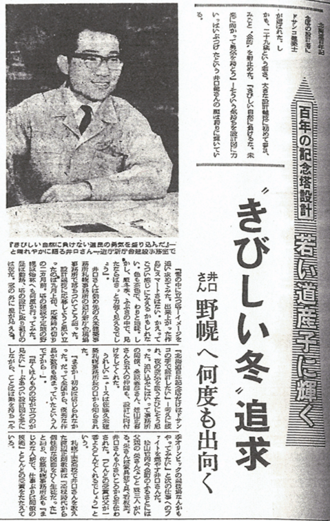 北海道百年記念塔の設計者にドサンコ建築士が選ばれた。しかも29歳という若さ。大きな設計競技は初めての参加、みごと〝金的〟を射止めた。「きびしい自然に負けるな。未来に向かって勇気を持とう」という姿勢を設計図に力いっぱいぶつけたという井口さんの顔は誇りに輝いている。