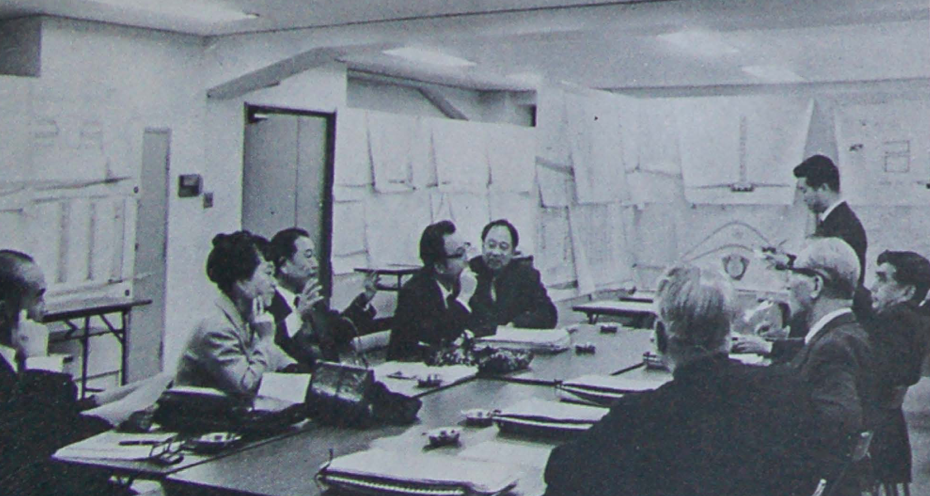 左から横山尊雄・関文子・大野和雄・田上義也・高山英華・島本融・佐藤武夫・谷口吉郎