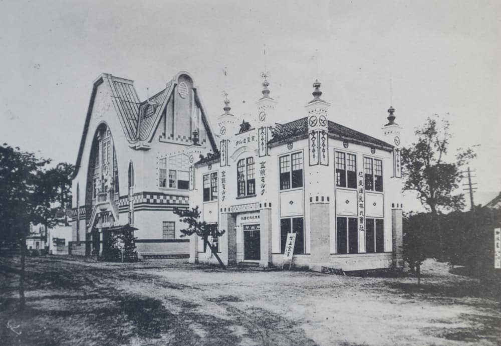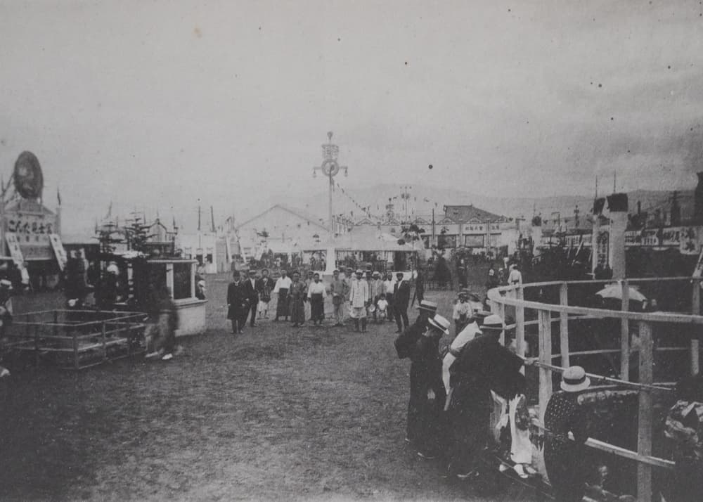 水産館の裏手には牛馬、豚、鶏などの家畜を集めた共進会場が設けられていました。