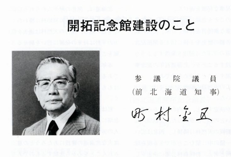 私はこのようなことを念頭におきながら、有識者の方々の貴重なご意見を拝聴した末、先人の厳しく激しい苦闘の歴史を子孫に伝える開拓記念館と北海道の洋々たる前途を象徴するような記念塔を建設することを北海道百年事業として採用することを決めたのである