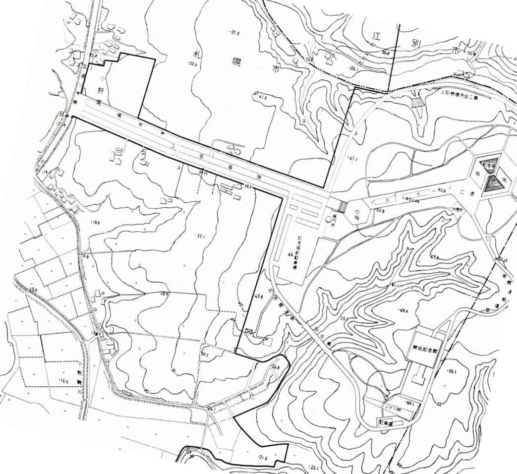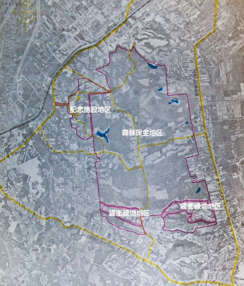 野幌森林公園計画図(出典②)背景の空撮写真を見ると開発が