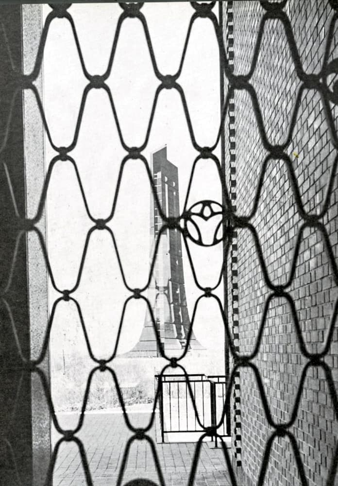 北玄関脇グリルを通して塔を望む(出典⑦)