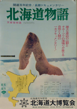 道(観光課)の百年記念の企画で読売映画社が製作したカラー35ミリ,シネマコープ『北海道物語』は、今日の北海道の自然と人間のきびしくも美しい触れ合いを綴った長編ドキュメンタリーである。3年間にわたった取材行程5万キロ、延べ16か月のロケーションで8万フィート(映写時間約15時間)のフィルムを1時間30分の作品にまとめたもの。昭和43(1968)年7月、全国映画館でいっせいに封切られた。同年の日本映画の中の文部省特選のひとつとなった。[16]