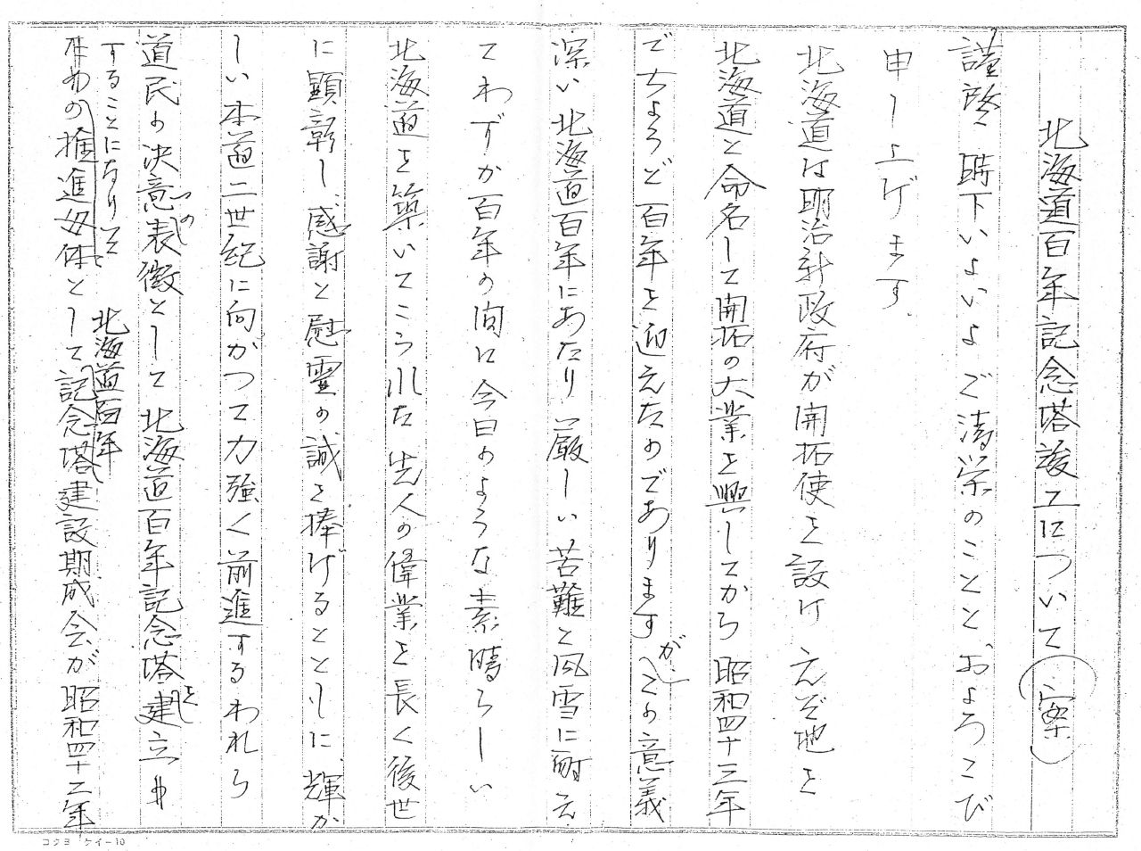 爾来、お陰様をもちまして道内各界各層より多大なご支援とご協力をいただき、昭和43年11月、道央要衝の地札幌市厚別町下野幌の高台、すなわち道立自然公園野幌森林公園内に工を起こし、その後の工事は順調に取り運び、別添記念塔概要並びに写真でご覧の如く塔高は北海道百年にちなみ100メートル、その外形の容姿は、荒々しい原始の大自然と過酷な風雪に挑んだ雄々しい開拓者の精神を秘めて、千歳の大樹のごとく大地に根を広げて安定し、その尖端は限りなき伸びゆく力を指南し、輝かしい郷土の未来を象徴する誠に 建設の意図にふさわしい記念塔が完成したのであります。
