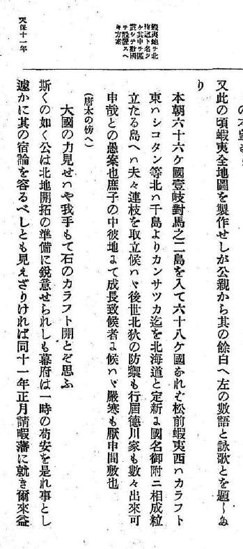一 國名を撰び相願候て蝦夷といふ名を改可申 日出國と願可申候 寅卯之方の島なれば日出の文字も相當にて 且又日本より日の出るといふもことはりなれば かたがたよろしき也 其の他郡を分け村名をつけ統て夷言は相止可申候