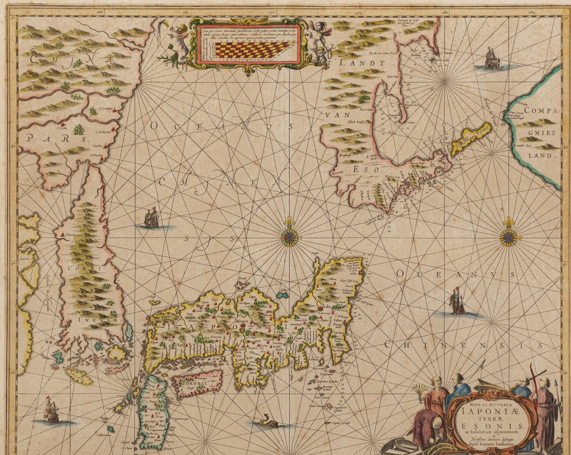 寛永二〇(一六四三)年七月には、黄金の島ジパングを求めて冒険の旅に出たオランダのフリースが樺太の亜庭湾に上陸。その後、海に出て間宮海峡を北緯四九度あたりまで進んだものの濃霧のため引き返しました。フリースが半島と思い込んでに伝えたため、ヨーロッパでは長く樺太は半島と思われていました。