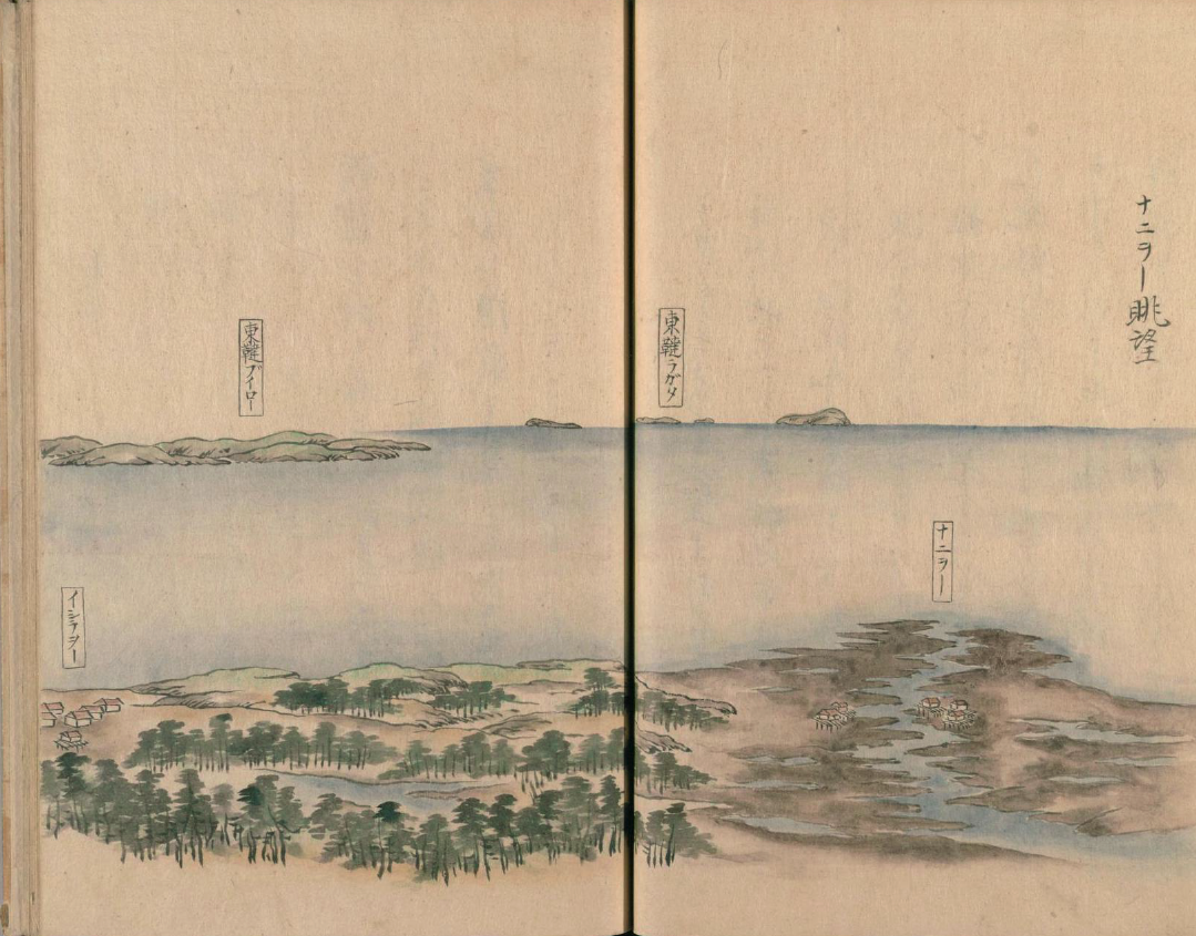 同十二日、ここを発し、その日ナニオーに至り着きぬ。ここ既にこの島の極北の地にして夷家僅か五〜六屋あるところなり。ノテトよりここにいたるの間、島と東韃地との相対せる迫峡にして、湖水ことごとく南に流れ、その間潮路ありといえども波涛激沸の愁も少なく、小軟の夷船なれども進退さまで難きことなし。ここよりして北地は北海漸に開け、湖水ことごとく北に注ぎ、また波大いに激起すれば、船を遣ること能わず。さらば山を超えて東岸に出んといえども、従夷また従いがんぜす。止事をえずして、同十七日船を返し、同十九日終にノテトへ帰りに至れり。