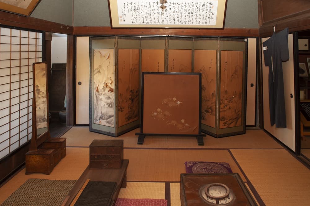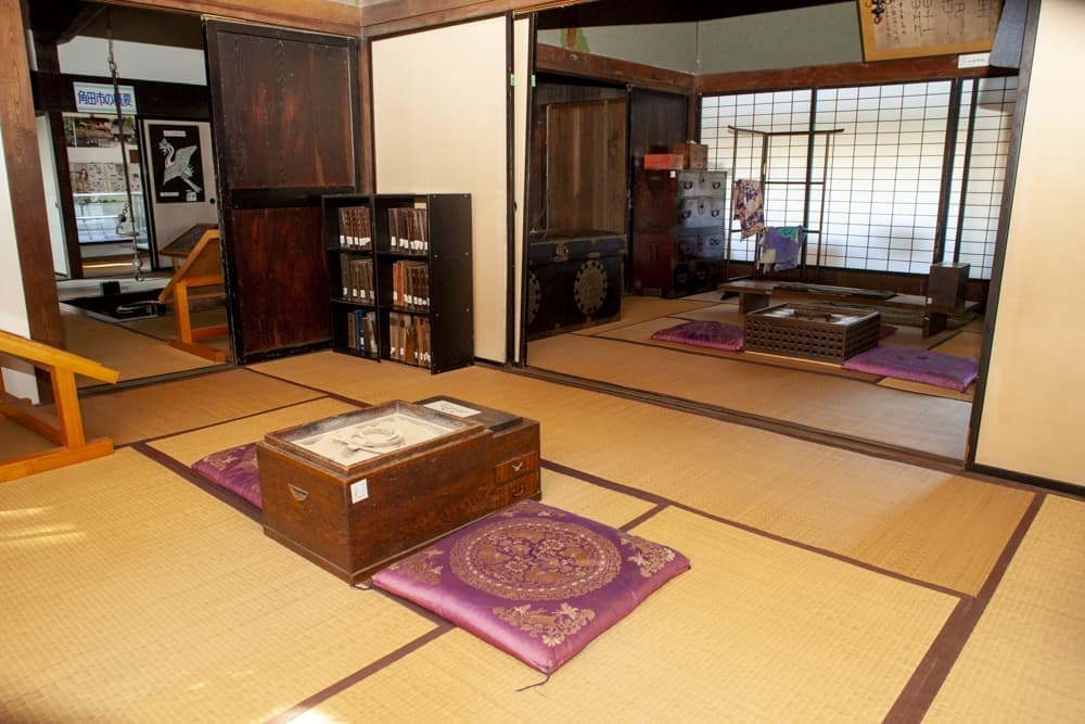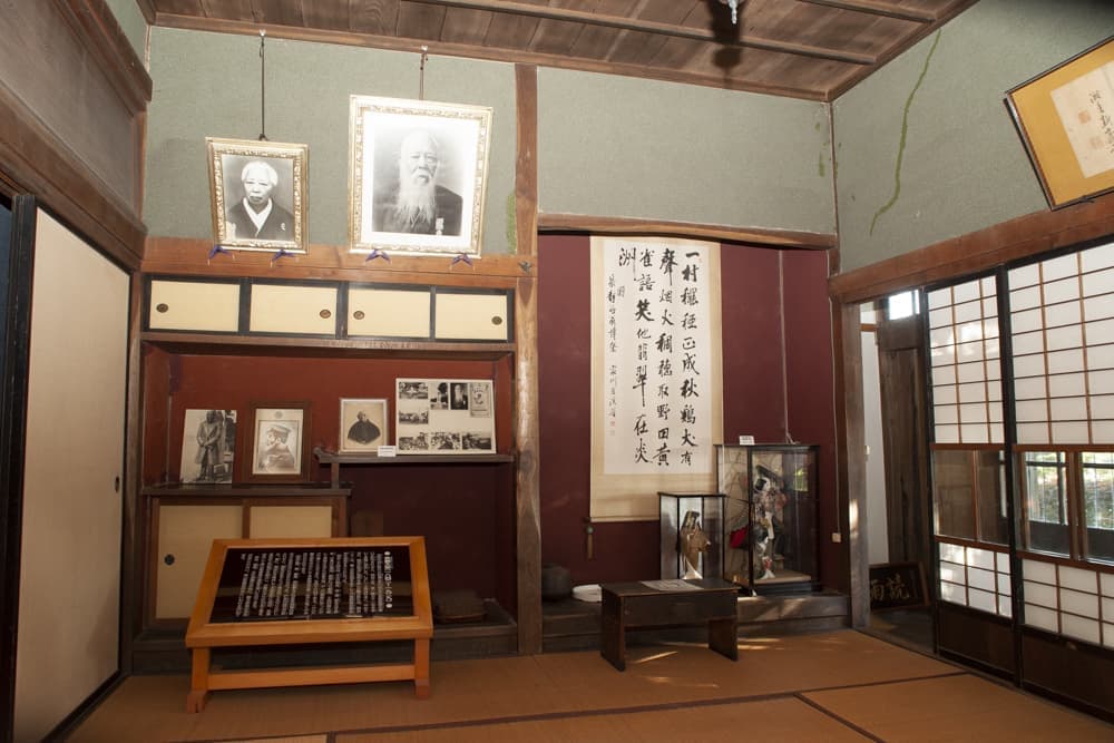床の間には麟太郎夫妻の肖像、掛け軸がそのままに遺されています。