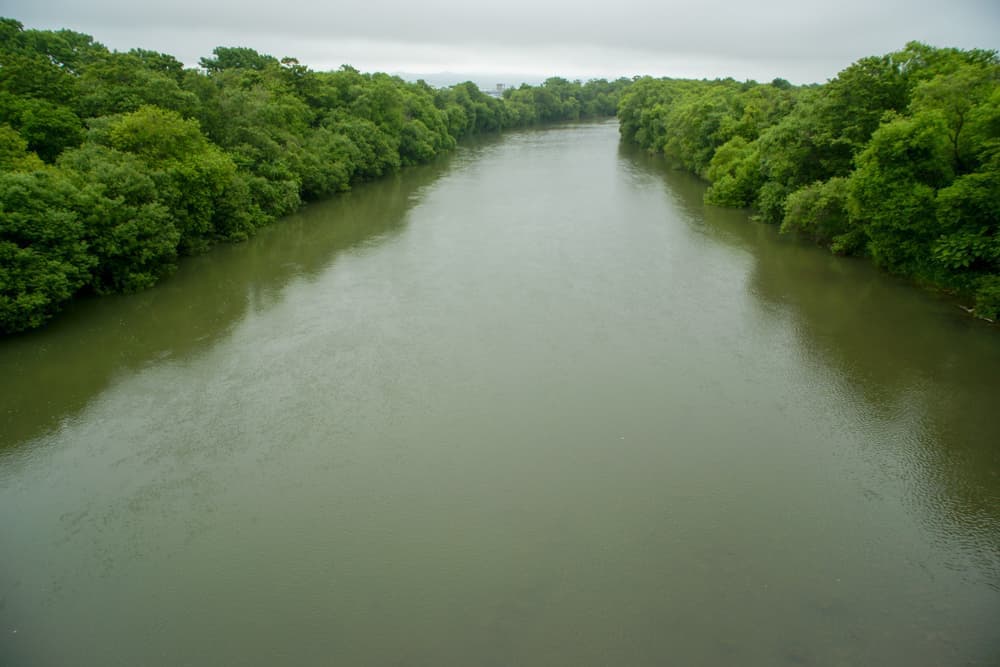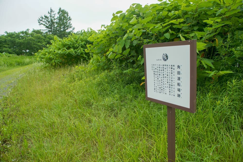 明治21(1888)年5月、室蘭を出発した泉鱗太郎一行は雪解け水を湛えた夕張川に行く手を遮られますが、千歳のアイヌ・テッピリア(下夕張鉄五郎)によって助けられ、対岸に渡ることができました。テッピリアはその後、明治42(1909)年に夕張橋ができるまで夕張川の船渡しとして開拓者を助けます。上写真の「角田渡船場跡」の掲示板は角田神社のそばにあるものですが、下写真の「夕張橋」から見る方が当時の雰囲気をつかむことができるでしょう。