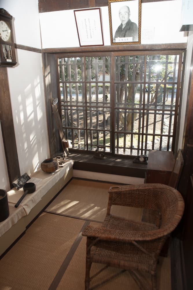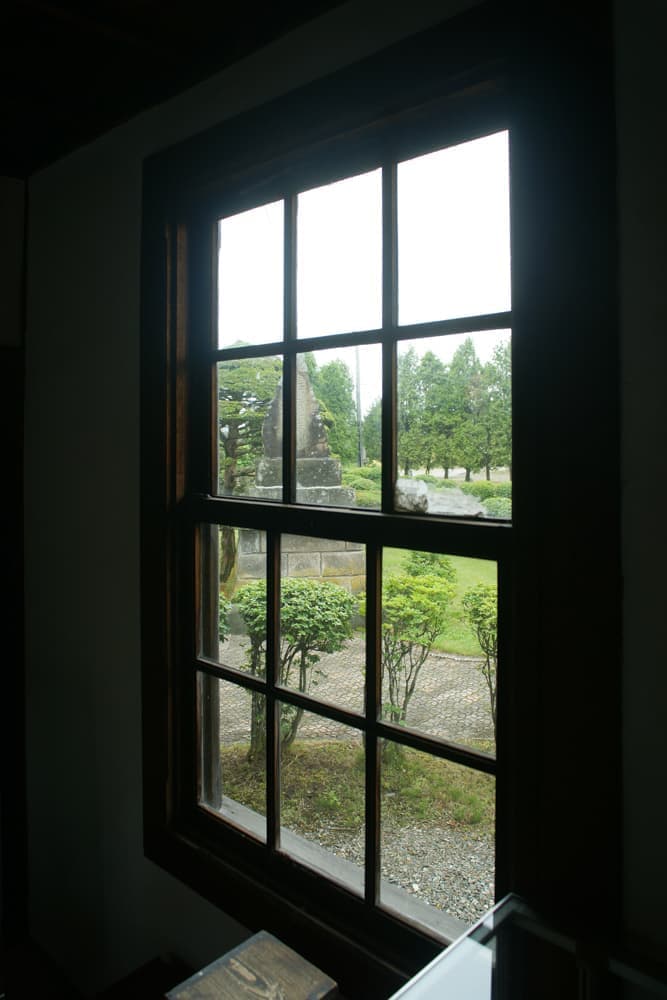 鱗太郎に関わる資料が展示されています。ここの窓は上下に開く洋式で、窓から見えるのは、明治33年に角田神社に建てられた敷地内に移設された泉鱗太郎記念碑です。