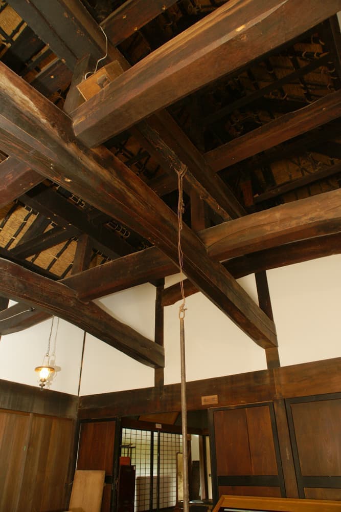 天井まで吹き抜けとなっています。巨木をふんだんに使った梁組が見どころです。