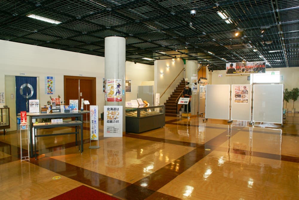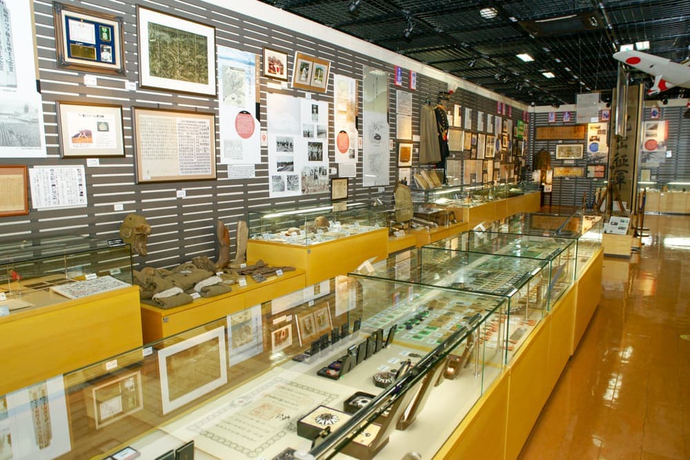 1階展示ホールです。中央ロビーは広々としていますが、周囲に図書コーナー、自衛隊コーナー、企画展示コーナーなどがあります。筆者の心を捉えたのが中央の展示ケース。