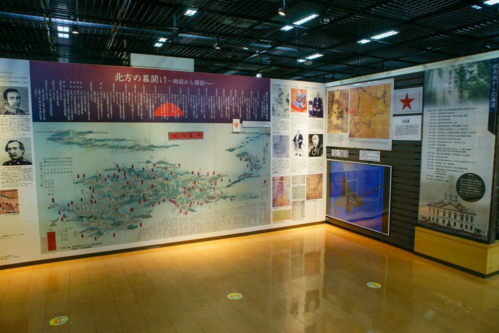 1階ロビーから続く階段を登り、2階の展示室に入ると、最初に目に入るのがこの展示です。北から迫る欧米列強の脅威から日本を護ることが明治維新の目的であり、北海道開拓の目的出会ったことがよくわかります。