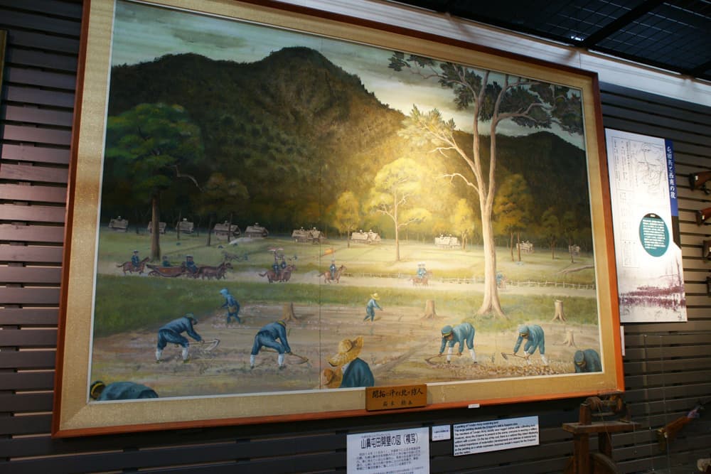 明治14(1881)年、明治天皇が北海道巡幸をなされたおり、札幌の山鼻屯田を視察されたときの模様を描いたものです。模写ですが、原画は「明治天皇八大巡幸」の一枚で明治神宮宝物館にあります。明治天皇が北海道開拓に強い関心をお持ちだったことを示します。
