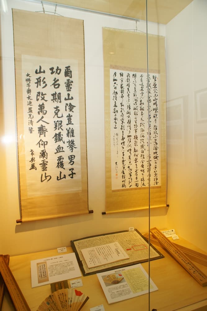 左の掛け軸は、2代目第七師団長大迫尚敏中将に対して第三軍司令官・乃木希典将軍が直々に送ったもので、乃木大将の直筆です。大迫中将の曾孫さんから令和2年7月に北鎮記念館に寄贈された大変貴重なものです。
