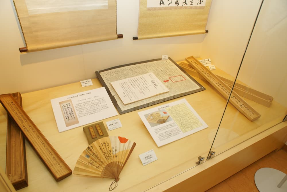 左下の扇は、乃木大将など日露戦争を指導した指揮官達の寄せ書きを扇にしたものです。日露戦争中に著名された者と考えられ、上の掛け軸が収められた木箱の中にありました。名だたる方々の直筆署名で、その歴史的価値は計り知れません。