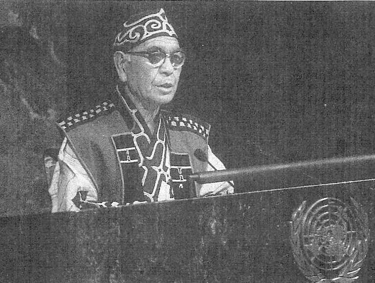 国連総会で演説する野村義一北海道ウタリ協会理事長(③)