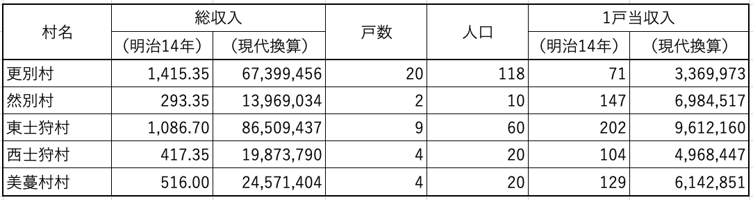 明治14年、音更のアイヌ部落では1戸当たり336万から961万もの収入があったことがわかります。しかもこれは1月から6月の半期です。単純に倍になるとは言えませんが、年間収入はこれより上回ることは確実です。