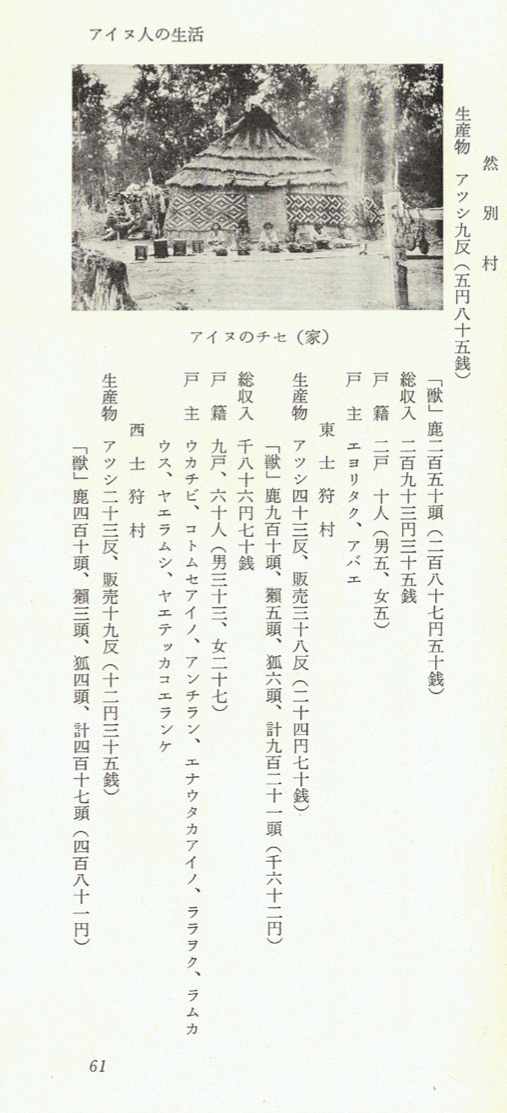 土人ノ現今ノ生活ヲ視ルニ、概シテ暮ラシ安キモノノ如シ。何トナレハ標茶ノ開市ニヨリ、或ハ雇人ト為り、或ハ其他ノ方法ヲ以テ利ヲ得ル、又昔日ノ比ニ非ス。故ニ衣服二食類に漸ク風化シ、今日ニ至テハ毎戸一日一回以上ハ必ス米ヲ食スニ至レリト云フ [3]