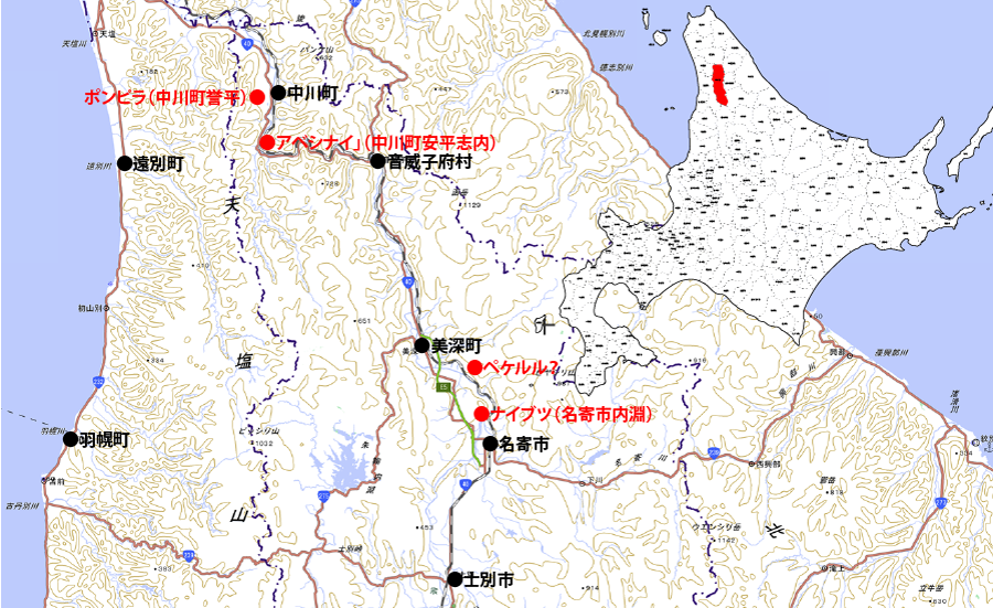 しかしして部落を集会して、将来一部落をなす適当の位置は、字「ナイブツ」(名寄市=内淵)、「ペケルル(美深町)「アベシナイ」(中川町安平志内)「ポンピラ」(中川町誉平)の4ヶ所とす。