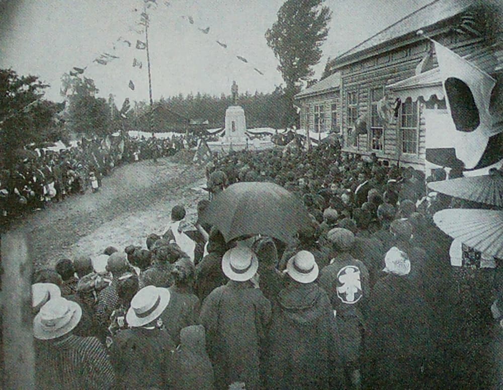 大正12(1923)年7月15日に泉麟太郎翁並びに夫人満津子の夫妻を正賓として、盛大な除幕式が挙行されました。この銅像は太平洋戦争による貴金属供出命令によって昭和18(1943)年に供出されましたが、戦後の秀和25年、栗山町町制施行を記念して再建され、現在は栗山町役場構内でまちの発展を見守っています。