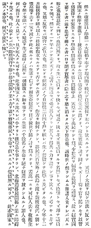 いやしくも官を罵るを以て智と為し、法律を不完全とすることを学識と為し、暴力を振うことを勇と為す。眼中に上は天皇なく下は兆民無しと為し、少壮の者を扇動して乱民を誘導している。そのために真実国を憂える者は退き、忠義の者は口を閉じ、実学者はこれを陰で憂えている(中略)。