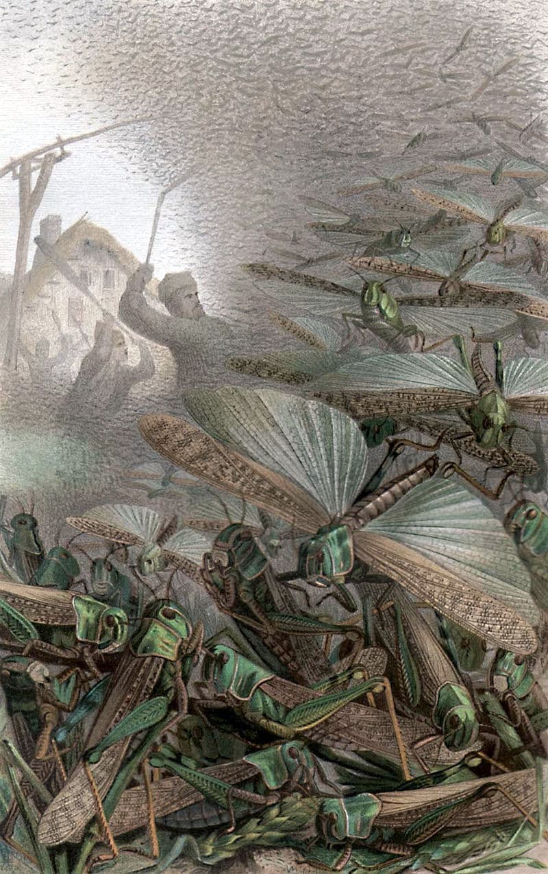 ひとたび地上に降下すると、畑作物といわず雑草といわず、これを食べ尽しては、どこかへ飛び去った。緑の野は、たちまちにして赤褐色に変じ、住民は呆然として惨状を見守る以外にすべはなかった。