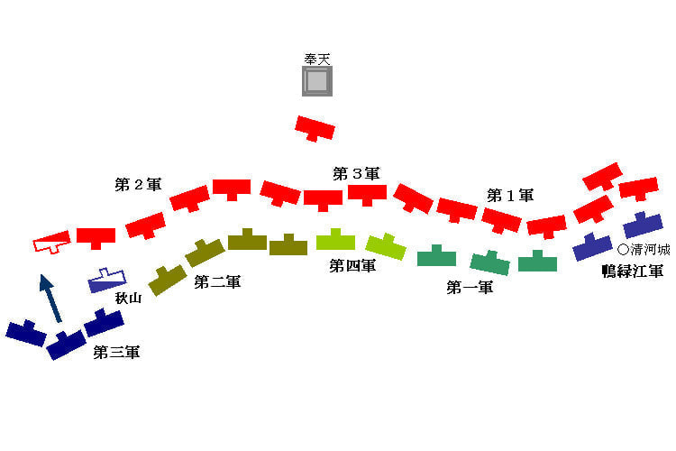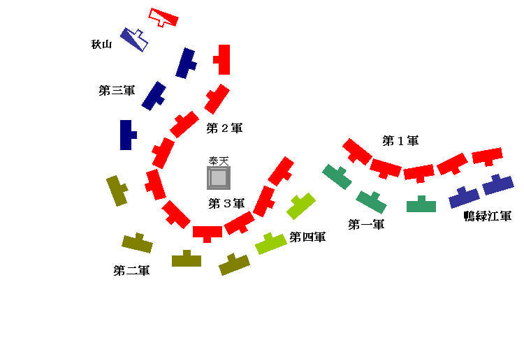 しかしてこの軍は旅順陥落後、直ちに北進を開始し、奉天戦に参加の行動をとったのである。すなわち2月上旬、予定の地点に達し、東南は遼陽の線より西北は大子河の線にいたる約12里にわたる距離に長蛇の陣を張った。その任務は満州軍の左翼部隊たる奥軍と連なり、最左翼軍として迂回行動軍の役割を果すこととなっていたものである。