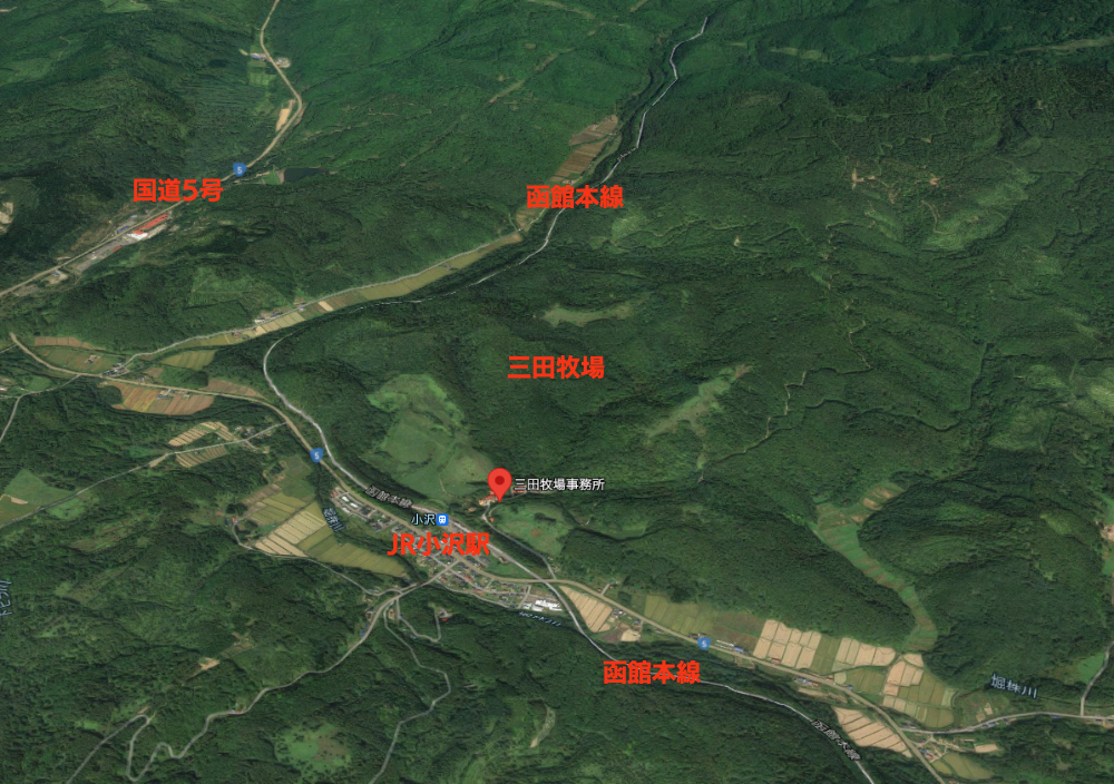 三田牧場は、岩手県盛岡市、三田義正の経営であって、小沢駅を距ること1町、鉄道沿線に沿って北方に位置し、眺望の良い位置を占めている。明治35(1902)年に大沢村字ヤエニンベに900余町の未開地を道庁から貸与され、7月16日、初めて開拓に従った。当時はもちろん大森林で、昼なお暗い有り様であった。